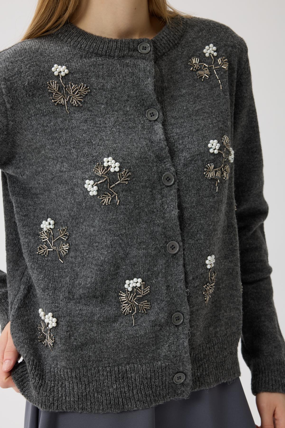İşlemeli Triko Hırka Antrasit